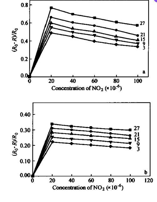 LB膜越薄,與氣體的接觸越充分,被氧化的程度也越高,因而對(duì)氣體的響應(yīng)也就越快。同層的PAN/NMP LB膜較PAN-AA/NMP LB膜具有更快的響應(yīng)。3層聚苯胺LB膜對(duì)相對(duì)百分比為20×10??NO?的響應(yīng)時(shí)間為10 s,但是當(dāng)層數(shù)增加到27層時(shí),響應(yīng)時(shí)間就上升到90 s。而對(duì)于27層的聚苯胺與乙酸的混合LB膜,響應(yīng)時(shí)間就更長(zhǎng),接近3 min。另一方面,響應(yīng)時(shí)間還隨NO?氣體濃度的增加而增長(zhǎng)。圖5反映了15層聚苯胺LB膜的響應(yīng)時(shí)間與氣體濃度變化之間的關(guān)系。在相同氣體濃度下,PAN/NMP LB膜較PAN-AA/NMP LB膜具有更快的響應(yīng)和更好的靈敏度。PAN/NMP LB膜對(duì)相對(duì)百分比為20×10??NO?的響應(yīng)時(shí)間為30 s,而PAN-AA/NMP LB膜則為50 s。當(dāng)氣體濃度增大到相對(duì)百分比為100×10??時(shí),響應(yīng)時(shí)間分別變化到150 s和180 s。