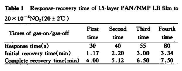 在敏感特性的測(cè)試過(guò)程中,我們發(fā)現(xiàn)純聚苯胺LB膜對(duì)NO?具有較好的敏感性。聚苯胺LB膜的敏感性及響應(yīng)時(shí)間與LB膜的層數(shù)有密切關(guān)系。隨層數(shù)的增加,對(duì)NO?的響應(yīng)時(shí)間逐漸增長(zhǎng),這可以從圖4中看出。