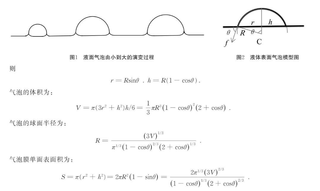氣泡一般是由于氣體通過小孔浸人液體層后分散擴(kuò)張形成的.在氣泡形成過程中,由于液體表面張力的作用,使液膜呈收縮趨勢.球形氣泡的液膜表面積最小,所以,在沒有其他因素影響的條件下,空中和液體中的氣泡應(yīng)處于球形的亞穩(wěn)狀態(tài).當(dāng)氣泡落在液體表面或由液體內(nèi)部上升到液體表面以后,沒破裂的氣泡不再呈現(xiàn).球形狀態(tài),與液體表面直接形成的氣泡一樣,呈現(xiàn)球缺形狀.液面氣泡由小到大的演變過程如圖1所示.當(dāng)氣泡足夠大時(shí),液體表面氣泡實(shí)際形狀接近半球,但在氣泡與液體表面接觸處可觀察到氣泡內(nèi)、外均存在液面向上彎曲現(xiàn)象,且泡內(nèi)水平液面相比氣泡外水平液面位置出現(xiàn)微小凹陷.