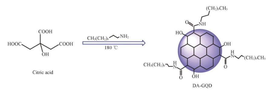 首先采用“自上而下”法,由CX-72炭黑在濃硝酸中回流24 h制備GQD。雖然能夠實現一步同時制備單層和多層GQD,但是存在反應時間長、強酸會對環境造成一定污染等弊端。本實驗設計通過“自下而上”法,以檸檬酸為前驅體、直鏈烷基胺為功能化試劑,通過一步熱裂解制備雙親性DA-GQD(見圖1)。檸檬酸分子之間脫水縮合形成六邊形sp2碳原子鍵合的石墨烯片,十二胺通過氨基與檸檬酸上的羧基縮合,將烷基鏈引入石墨烯片的邊緣以提高疏水性。