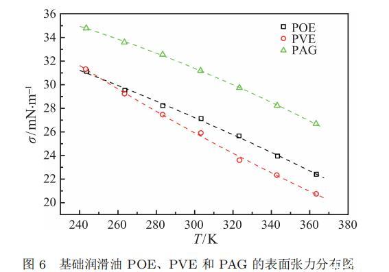 圖 6 基礎(chǔ)潤滑油 POE、PVE 和 PAG 的表面張力分布圖