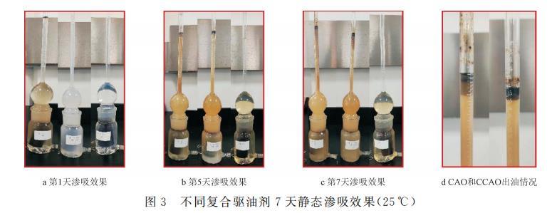 將巖心在110℃下烘干,稱(chēng)重;將飽和好油的巖心置于阿莫特密封瓶(Amott cell瓶)中,分別加入試樣溶液(CAO、CCAO或FHQ-I的標(biāo)準(zhǔn)溶液)至略超過(guò)Amott cell瓶的最低刻度處,在25℃環(huán)境中,觀察并記錄其出油體積,通過(guò)計(jì)算得到的結(jié)果見(jiàn)表5,同時(shí)觀察不同時(shí)間飽和巖心滲吸出的原油形態(tài)(如圖3所示)。