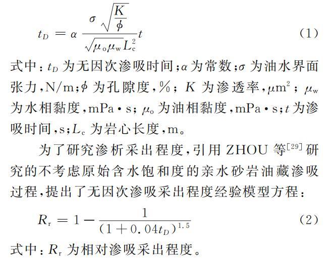 為研究黏度及界面張力對(duì)滲析采出程度的影響,引用MA等推導(dǎo)出的公式(1),式中同時(shí)考慮了親水系統(tǒng)和滲吸親油系統(tǒng)的無(wú)因次滲吸時(shí)間。