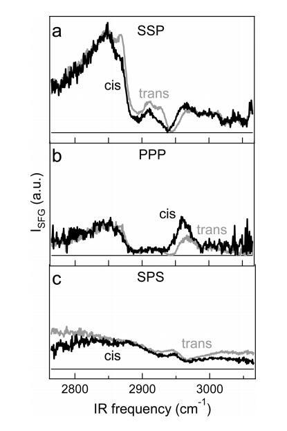 圖5.(a)在P的反式和順式狀態(tài)下,每分子65?2面積的DT Azo-5P純單層的標(biāo)準(zhǔn)化VSFG光譜與SSP極化分別為6和20 mN/m。(b)與a部分類似,但對(duì)于PPP極化。(c)反式和順式狀態(tài)的SPS極化中的SFG光譜( ~ 每分子78?2),壓力為2和15 mN/m。三個(gè)面板具有相同的垂直刻度。