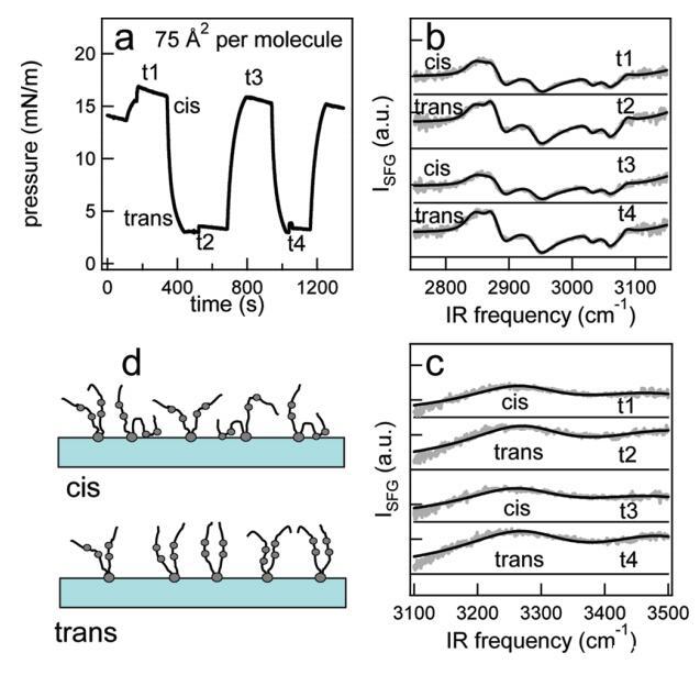 圖4。 (a) 在每分子面積為75?2的脂質(zhì)/H2O界面處,作為光開關(guān)脂質(zhì)時(shí)間函數(shù)的表面壓力。 用370和450 nm光照射 ~ 100秒分別產(chǎn)生順式(高壓)和反式(低壓)狀態(tài)。 壓力的微小劇烈波動(dòng)是由于樣品高度的變化,以校正水的蒸發(fā)。 (b和c)CH和OH區(qū)域(灰色)中相應(yīng)的VSFG光譜以及洛倫茲線形狀模型的擬合(見正文)。 為了清晰起見,光譜已被抵消。 t1至t4對(duì)應(yīng)于面板a中獲取光譜的時(shí)間。 (d) 脂質(zhì)尾部方向的示意圖。 光開關(guān)脂質(zhì)的偶氮苯部分用灰色圓圈表示。