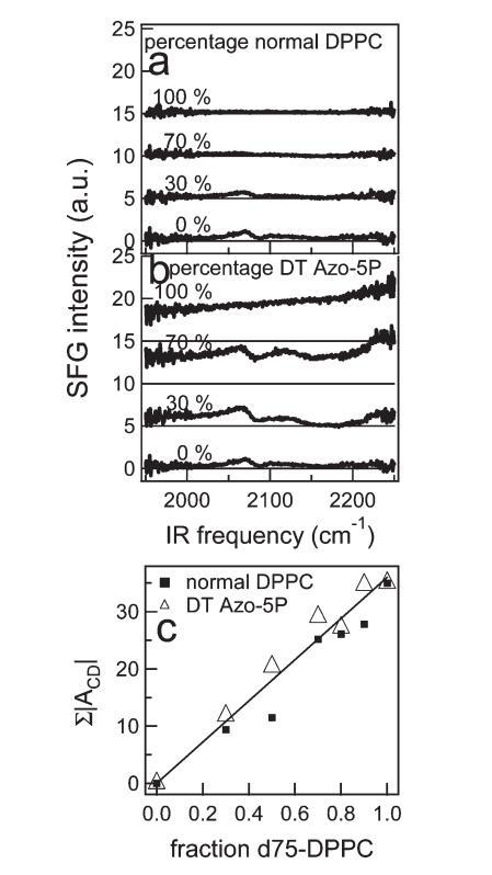 圖9。 (a) 正常DPPC和d75 DPPC不同混合物的CD區(qū)VSFG光譜。 圖中給出了混合物中正常DPPC的百分比。 為清晰起見,光譜偏移,細(xì)線表示零。 (b) 與a部分類似,但適用于DT Azo-5P與d75 DPPC的混合物。 (c) 通過(guò)擬合文中描述的VSFG光譜獲得的CD振動(dòng)振幅之和,作為含正常DPPC或DT Azo-5P的二元混合物中分?jǐn)?shù)d75 DPPC的函數(shù)。 在本實(shí)驗(yàn)中,為了獲得混合物的高質(zhì)量數(shù)據(jù),IR通量很高,導(dǎo)致通過(guò)VSFG光譜中相對(duì)較高的CH2和CD2振幅觀察到的脂質(zhì)尾部出現(xiàn)小的無(wú)序。