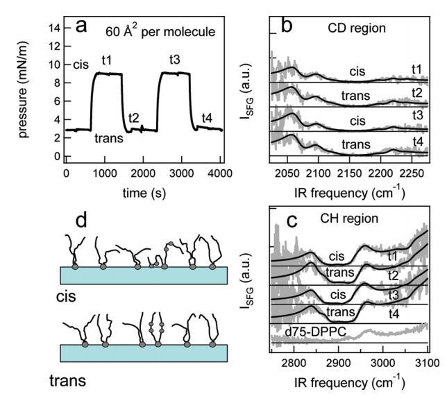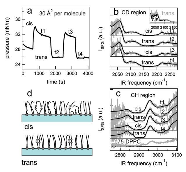 圖6。在脂質(zhì)/H2O界面處,DT Azo-5P/d75 DPPC的1:5混合物的結(jié)果,每個(gè)分子的面積為60?2。(a) 表面壓力與時(shí)間的關(guān)系。用370和450 nm光照射~100秒分別產(chǎn)生順式(高壓)和反式(低壓)狀態(tài)。壓力的微小劇烈波動(dòng)是由于樣品高度的變化,以校正水的蒸發(fā)。(b) 相應(yīng)的VSFG光譜(灰色)以及CD區(qū)域的擬合。為了清晰起見,光譜已被抵消。(c) VSFG光譜(灰色)以及用于引導(dǎo)眼睛進(jìn)入CH區(qū)域的擬合。底部曲線顯示了在P時(shí)純d75 DPPC的光譜~ 40百萬(wàn)/米。(d) 脂質(zhì)尾部方向的示意圖。光開關(guān)脂質(zhì)的偶氮苯部分用灰色圓圈表示。