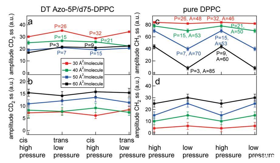 圖8.在d75 DPPC和DT Azo-5P(左)的5:1比率的實(shí)驗(yàn)中,d75 DPPC和純正常DPPC(右)的擬合結(jié)果。(a)CD3對(duì)稱拉伸振動(dòng)模式的振幅作為不同密度的光開關(guān)脂質(zhì)狀態(tài)的函數(shù);(b)CD2對(duì)稱拉伸振動(dòng)模式的振幅作為不同密度的光開關(guān)脂質(zhì)狀態(tài)的函數(shù);右圖顯示了純DPPC的類似結(jié)果,壓力與左圖相似,其中(c)CH3對(duì)稱拉伸振動(dòng)模式的振幅和(d)CH2對(duì)稱拉伸模式的振幅。共振的寬度和頻率在擬合中是固定的。