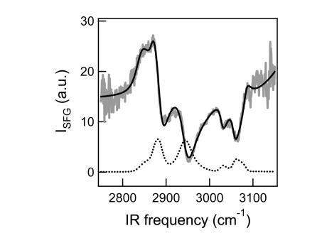 DT Azo-5P單分子膜的振動(dòng)和頻發(fā)生光譜(VSFG)。圖3a描繪了在3 mN/m的表面壓力和75?2的分子面積下,處于反式狀態(tài)的光脂DT Azo-5P凝聚相的單層的灰色VSFG光譜。光譜顯示了CH2的共振(~2840 cm-1)和CH3對(duì)稱拉伸模式(~2860 cm-1),CH2和CH3不對(duì)稱拉伸模式~2890和2940 cm-1,以及3000 cm-1以上的芳香CH信號(hào),源自偶氮苯部分。2,11-13 3100 cm-1以上,光譜主要由水亞相的OH振動(dòng)控制。頻譜在低頻時(shí)有一個(gè)不尋常的高(非零)基線,這表明一個(gè)高非共振信號(hào)。為了檢查這種可能性,使用以下表達(dá)式擬合光譜:11,12