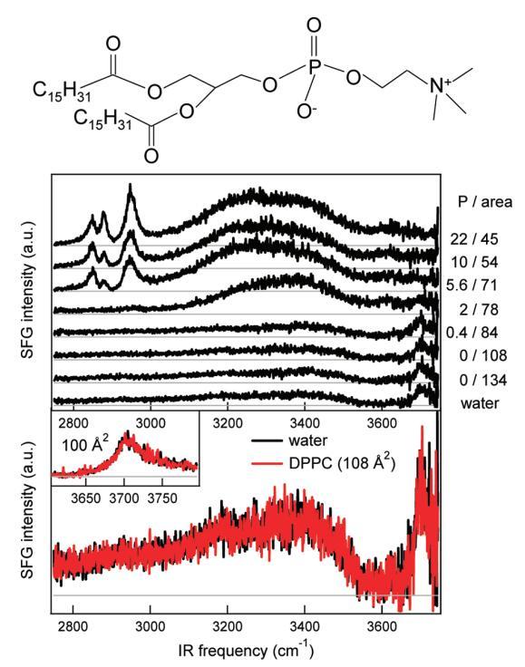 圖1。頂板:DPPC的分子結(jié)構(gòu)。中間面板:裸露水面(底部光譜)和密度增加的水中DPPC的SSP極化SFG光譜。壓力(mN/m)和每個(gè)分子的面積(?2)分別從底部到頂部增加和減少,在圖表旁邊給出。每個(gè)分子的面積由氯仿溶液滴的數(shù)量控制。CH(2800)?3000厘米?1),氫鍵OH(3000?3600厘米?1),還有免費(fèi)的哦(~3705厘米?1)拉伸振動(dòng)可見。底部面板:從裸露水面的中間面板放大,每個(gè)分子的DPPC為108?2,以表明它們的相似性。插圖放大了裸露水面和DPPC(100?2)表面的自由OH拉伸振動(dòng)區(qū)域。在每個(gè)分子的這個(gè)區(qū)域,壓力仍然低于檢測極限,表面上DPPC的存在顯然不影響自由OH拉伸振動(dòng)的振幅。相對(duì)較高的紅外通量(~10 mJ/cm2)用于本實(shí)驗(yàn)。