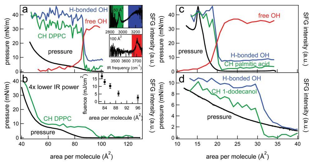 圖2。(a)DPPC的CH信號(hào)(綠色)、氫鍵OH信號(hào)(藍(lán)色)和自由OH信號(hào)(紅色)的表面壓力(黑色,左軸)和積分SFG強(qiáng)度(右軸),作為連續(xù)壓縮單層過程中每個(gè)分子面積的函數(shù)。為了清晰起見,集成SFG信號(hào)被歸一化,并且彼此之間具有小偏移。集成光譜區(qū)域由插圖中的彩色正方形標(biāo)記,分別顯示CH/OH鍵合和游離OH區(qū)域中每個(gè)分子50和100?2的SFG光譜。相對(duì)較高的紅外通量(~已使用10 mJ/cm2)。(b)與(a)類似,但紅外功率降低了四倍,導(dǎo)致通量降低了四倍(~2.5 mJ/cm2)。插圖顯示了改變紅外注量對(duì)SFG信號(hào)出現(xiàn)的每個(gè)分子面積的影響。(c)類似于(a),但適用于棕櫚酸。(d)類似于(a),但對(duì)于1-十二醇。在這種情況下,未測量1-十二醇的游離OH。SFG結(jié)果是在SSP極化下獲得的。