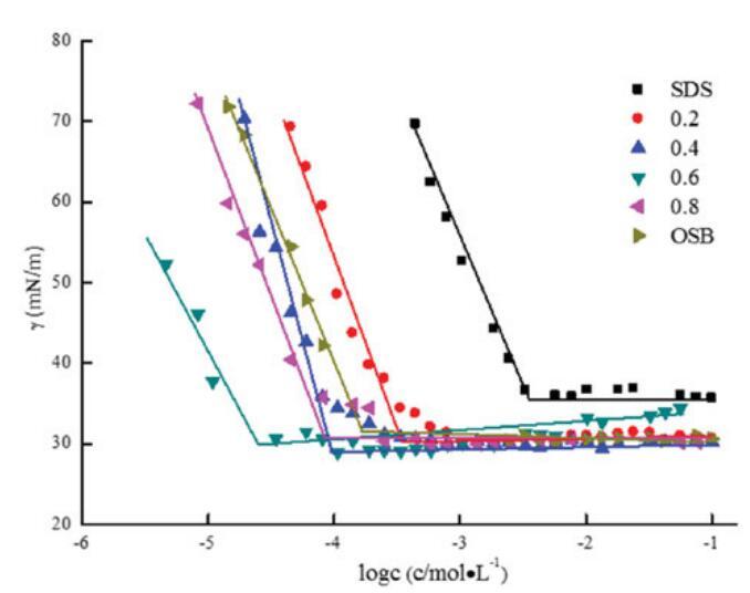 在25℃下測(cè)量了不同摩爾比的單獨(dú)OSB、SDBS和OSB/SDBS混合體系的表面張力。OSB/SDB(αOSB)的比率從0.2,0.4,0.6更改為0.8,總摩爾濃度固定為0.1 mol/L。圖7說(shuō)明了濃度與表面張力之間的關(guān)系,表4總結(jié)了表面張力參數(shù)。