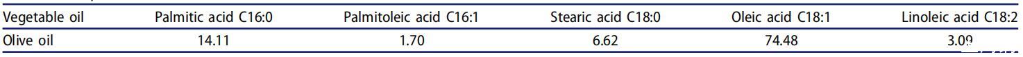 橄欖油含有各種脂肪酸甘油酯。我們使用GC-MS色譜法測(cè)定其結(jié)構(gòu)和含量,如表1所示。顯然,橄欖油最主要的成分是油酸甘油酯(74.48%),其次是棕櫚酸甘油酯(14.11%)和硬脂酸甘油酯(6.62%)。