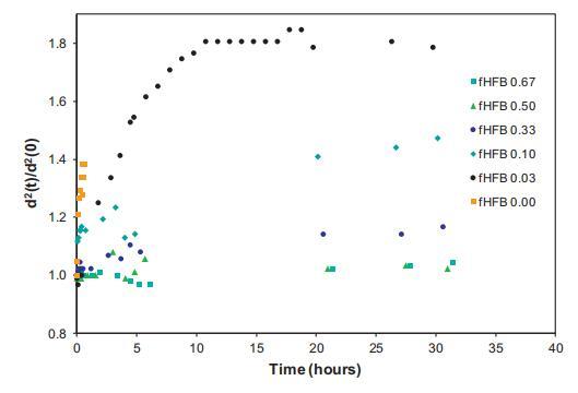 氣泡尺寸隨時(shí)間的相對(duì)增加如圖9所示,表示為d2(t)/d2(0)。考慮到環(huán)境充氣樣品的泡沫穩(wěn)定性,對(duì)于純HFBII系統(tǒng),在本實(shí)驗(yàn)期間未發(fā)現(xiàn)平均氣泡尺寸的顯著變化,表明幾乎不可能發(fā)生任何歧化。在純WPI的情況下,可以發(fā)現(xiàn)氣泡尺寸急劇增加,表明對(duì)歧化的穩(wěn)定性較差。在混合情況下,隨著fHFBII的增加,我們可以看到氣泡尺寸穩(wěn)定性增加的趨勢。我們可以粗略地說,當(dāng)fHFBII<0.2時(shí),氣泡大小的初始演化在很大程度上取決于WPI。然而,當(dāng)fHFBII>0.2時(shí),HFBII的存在控制泡沫穩(wěn)定性。這與在朗繆爾槽中觀察到的初始?xì)馀荽笮『臀綄拥内厔莘浅R恢隆?