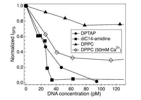 圖7(上圖)所示的壓縮等溫線清楚地表明,DNA對diC14氨基單層膜的影響,在很大的密度范圍內(nèi),是增加表面壓力,或等效地降低表面張力。也就是說,加入DNA后,表面生成的自由能總是變得更有利。然而,在沒有進(jìn)一步信息的情況下,這些實(shí)驗(yàn)幾乎無法深入了解表面熱力學(xué)變化的分子基礎(chǔ)。雙14-氨基單分子膜的CH區(qū)域的VSF光譜作為DNA濃度的函數(shù),以及由此產(chǎn)生的CH3SS/CH2 SS比率,提供了這樣的見解。如圖7(下圖)所示,向亞相添加DNA,即使在40 pM以下的體積濃度下,也會(huì)導(dǎo)致脂質(zhì)尾部順序的強(qiáng)烈增加。在解釋電子自旋共振研究的結(jié)果時(shí),貝納蒂及其同事曾認(rèn)為,吸附的DNA使凝膠相雙氰胺雙層(低于23°C)流態(tài)化,并使液相雙層(高于23°C)僵化,從而有效地平滑了在沒有DNA的情況下急劇的熱相變。91我們的光學(xué)和壓力等溫線測量都是在略低于熔融溫度的情況下進(jìn)行的。我們的壓縮等溫線表明,DNA的作用是增加表面上單個(gè)鏈之間的相互作用(降低表面張力),而光學(xué)測量表明,鏈相互作用的增加導(dǎo)致脂質(zhì)尾部更有序。有趣的是,這些結(jié)果與這樣一種情況是一致的,即DNA的加入似乎會(huì)產(chǎn)生脂質(zhì),兩者之間的相互作用比沒有DNA時(shí)更強(qiáng)烈,尾巴比沒有DNA時(shí)更有序,鏈的流動(dòng)性增強(qiáng)。這種脂鏈流動(dòng)性和脂鏈順序的解耦類似于之前觀察到的膽固醇和DPPC混合物隨溫度變化的情況。92