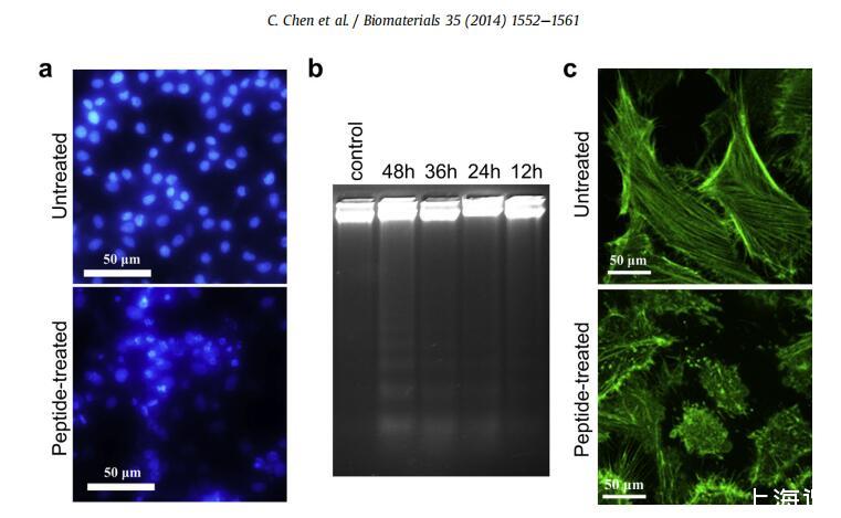 圖4。細(xì)胞凋亡的生化和形態(tài)學(xué)特征。(a)HeLa細(xì)胞與10 mM G(IIKK)3I-NH2孵育24小時前后的DAPI核染色。(b)HeLa細(xì)胞與10 mM G(IIKK)3I-NH2孵育后提取的基因組DNA的凝膠電泳分析。(c)在與10 mM G(IIKK)3I-NH2孵育24小時之前和之后,用FITC phalloidin對HeLa細(xì)胞進行F-肌動蛋白染色。