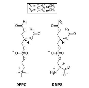 研究了兩性離子脂質L-1,2-二棕櫚酰-sn-甘油-3-磷酸膽堿(DPPC)和帶負電脂質L-1,2-二甲基-sn-甘油-3-磷酸絲氨酸(DMPS)的陽離子-脂質相互作用。脂質的結構如圖1所示。DMPS和DPPC單分子膜表現出非常相似的相行為,都顯示出不同的共存區域。28 DPPC和DMP都有飽和烷基鏈,烴鏈的長度略有不同。因此,這兩種不同類型的脂質呈現出良好的模型系統,其中陽離子-脂質相互作用可以遵循不同的階段,并且可以揭示脂質頭基電荷的影響。