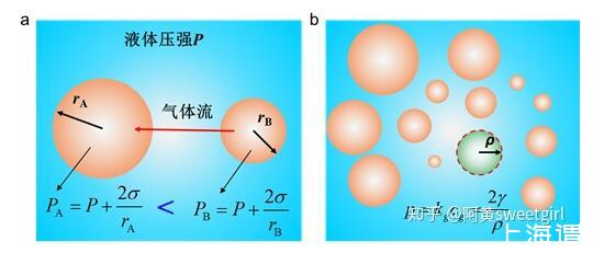 氣泡液體是大小不同的球狀氣泡分散到液體中的液氣體系。在氣泡液體中,大小不同氣泡是一個不穩(wěn)定的體系,其內(nèi)部不等的壓強會使整個體系變化,總體趨勢是氣泡半徑出現(xiàn)粗化現(xiàn)象,這種粗化跟晶體生長中的Ostwald熟化的現(xiàn)象是一致的(Ref 1)。根據(jù)附加壓力公式,可知較小的氣泡其內(nèi)部具有較大的壓強,因此與旁邊較大的氣泡間就會存在壓強差(圖1a),氣泡間液體兩側的壓強差會使氣體從壓強較大的地方向較小的地方擴散,從而出現(xiàn)大的氣泡增大,小的氣泡減小直至消失的情形,這就是氣泡Ostwald熟化的機理(Ref 2)。從能量的觀點來說,Ostwald熟化的結果降低了體系的表面能,從而使整個體系更加穩(wěn)定。