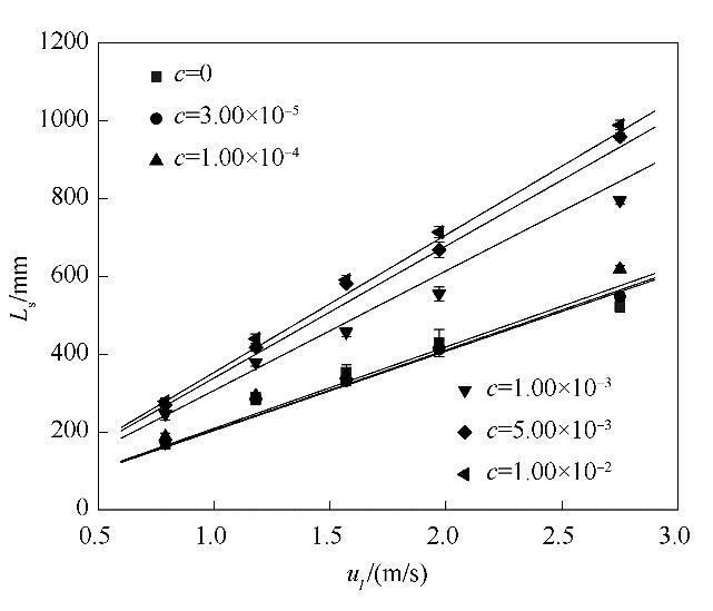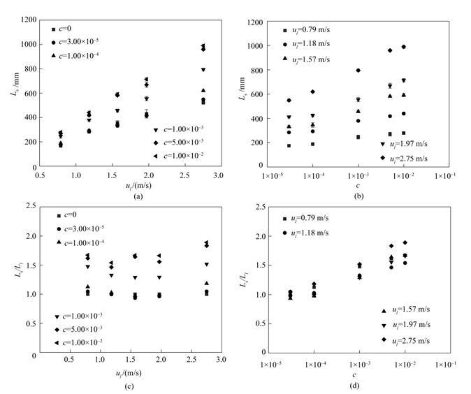 為了定量表征表面張力變化對(duì)射流破裂過程的影響,實(shí)驗(yàn)測(cè)量了含表面活性劑射流的射流破裂長(zhǎng)度。射流破裂長(zhǎng)度定義為噴嘴出口至射流首次發(fā)生破裂處的距離。圖6是含表面活性劑射流破裂長(zhǎng)度隨射流速度u l的變化趨勢(shì),其中L s(mm)表示含表面活性劑射流的射流破裂長(zhǎng)度,L l(mm)為水的射流破裂長(zhǎng)度。從圖6(a)中可以看出,當(dāng)表面活性劑濃度保持不變時(shí),提高液體射流速度會(huì)增大射流破裂長(zhǎng)度。從圖6(b)中可以看出,當(dāng)液體射流速度保持不變時(shí),隨著表面活性劑濃度的增大,射流破裂長(zhǎng)度總體上呈現(xiàn)逐漸增大的趨勢(shì);射流速度越大,射流破裂長(zhǎng)度增大的趨勢(shì)就越明顯。使用相同工況下水的射流破裂長(zhǎng)度無量綱化含表面活性劑射流的破裂長(zhǎng)度后,可以得到射流破裂長(zhǎng)度比隨射流速度以及表面活性劑濃度的變化趨勢(shì),如圖6(c)、(d)所示。從圖中可以看出,表面活性劑的加入顯著增大了射流破裂長(zhǎng)度比。在表面活性劑濃度不變時(shí),提高液體射流速度對(duì)射流破裂長(zhǎng)度比的影響并不顯著。在射流速度保持不變時(shí),提高表面活性劑濃度會(huì)導(dǎo)致射流破裂長(zhǎng)度比的增大。