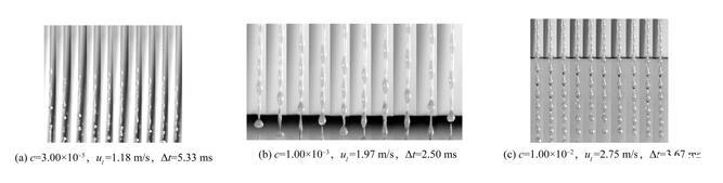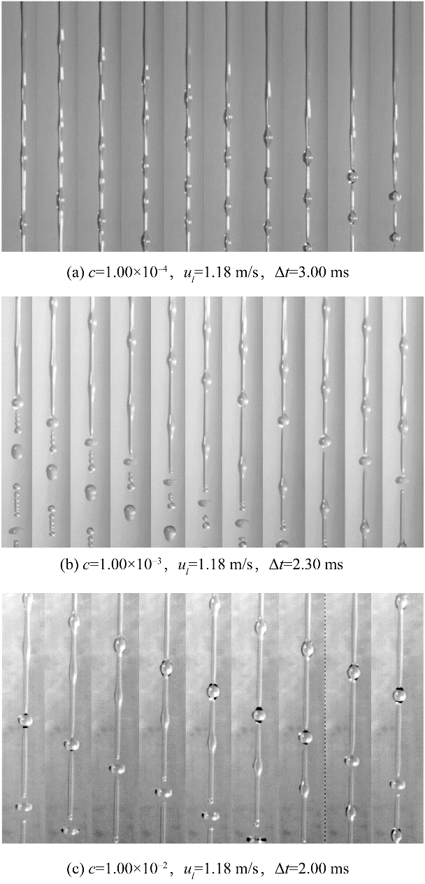 本文首先研究了不含氣泡的表面活性劑射流破裂過程以探究表面張力變化對(duì)射流破裂特征的影響。實(shí)驗(yàn)使用高速相機(jī)記錄了六種不同濃度表面活性劑溶液的射流破裂過程。實(shí)驗(yàn)獲得的射流破裂過程如圖5所示,其中Δt是相鄰兩張圖片間的時(shí)間間隔。從圖5中可以看出,雖然表面活性劑濃度并不相同,但射流的破裂過程在形態(tài)上是相似的。當(dāng)液體射流離開噴嘴后,射流表面擾動(dòng)迅速增長(zhǎng),表面波動(dòng)在射流表面呈對(duì)稱分布,這是射流破裂Rayleigh區(qū)的典型特征。隨著表面波動(dòng)的進(jìn)一步發(fā)展,在射流方向上,射流表面形成瘤狀結(jié)構(gòu),射流破裂發(fā)生在兩個(gè)瘤狀結(jié)構(gòu)之間。