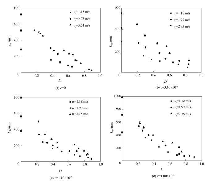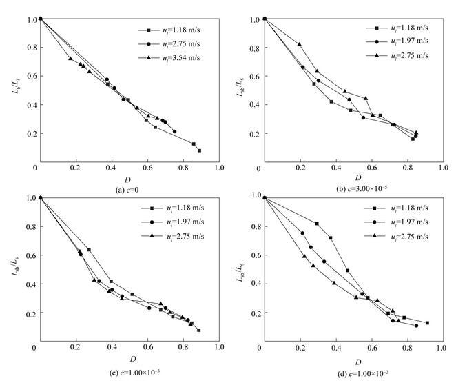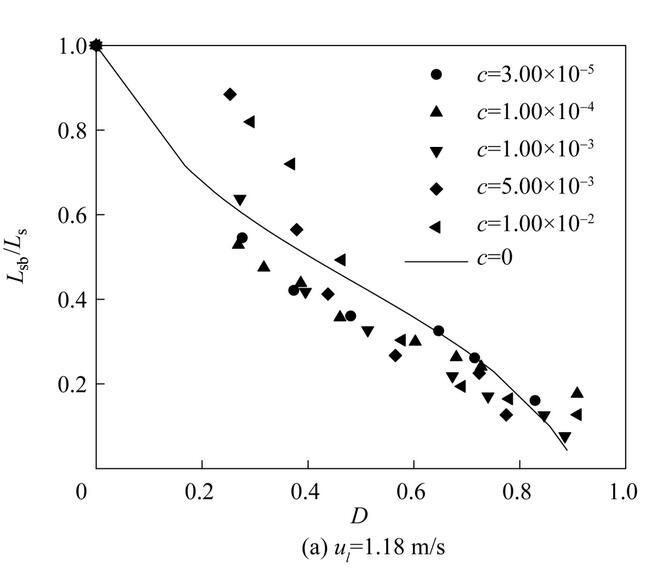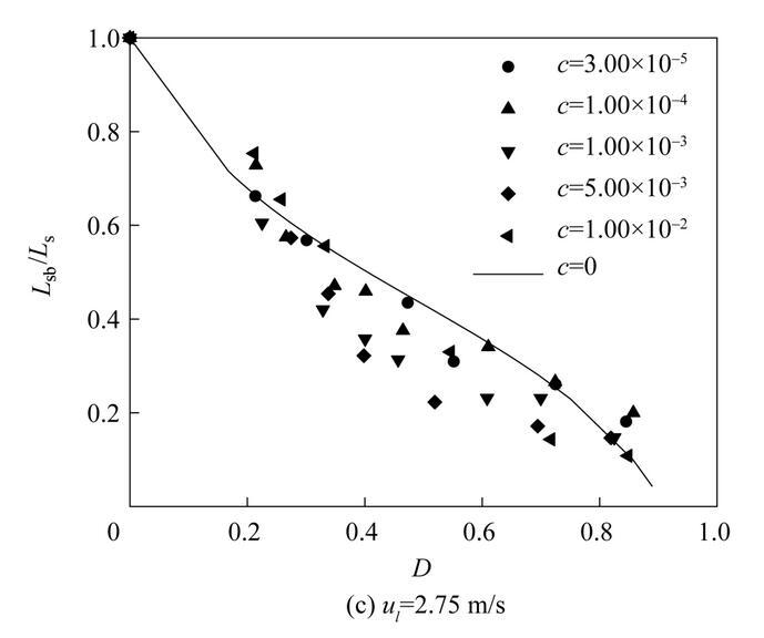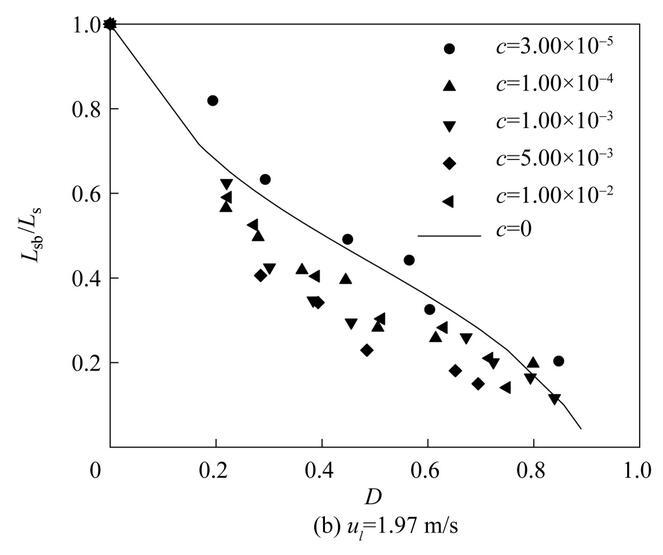 圖11是不同濃度表面活性劑射流破裂長(zhǎng)度L sb隨氣泡無量綱直徑D=d b/d 0(d b為氣泡直徑)的變化。從圖中可以看出,不同表面活性劑濃度下,射流破裂長(zhǎng)度隨氣泡無量綱直徑D的變化趨勢(shì)是相似的。射流破裂長(zhǎng)度隨著氣泡直徑的增大逐漸減小;當(dāng)氣泡直徑相同時(shí),提高液體射流速度會(huì)導(dǎo)致更大的射流破裂長(zhǎng)度。