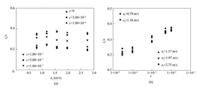從圖7(a)中可以看出,當(dāng)表面活性劑濃度保持不變時(shí),射流破裂時(shí)間幾乎不隨射流速度的改變而改變。在射流速度保持不變時(shí),隨著表面活性劑濃度的增大,射流破裂時(shí)間呈現(xiàn)逐漸增長(zhǎng)的趨勢(shì)。在實(shí)驗(yàn)參數(shù)范圍內(nèi),射流破裂時(shí)間均小于0.4 s。考慮重力對(duì)液體射流的加速作用,液體射流實(shí)際破裂時(shí)間要小于0.4 s。