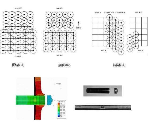為解決計算力學中的大變形問題,建立一系列SPH-FEM耦合算法:①固結;②接觸;③轉換。其中,SPH-FEM固結算法適用于同一物體內部,如沖擊問題中將靶板的彈著點區域離散為SPH粒子,其余部分離散為有限單元;SPH-FEM接觸算法適用于不同物體之間,如流固耦合問題中將流體離散為SPH粒子,固體離散為有限單元;SPH-FEM轉換算法適用于大變形位置和范圍未知的情況,如裂紋擴展問題,問題域初始離散為有限單元,計算中裂紋擴展方向上的有限單元轉換為SPH粒子。
