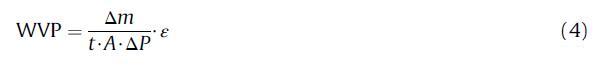 其中WVP=水蒸氣滲透率,單位g mm m-2次方h-1次方Pa-1次方;ε=厚度mm;m=質(zhì)量隨時間的變化,單位為g;t=h中的時間;A=薄膜面積,m2;和DP=杯內(nèi)薄膜表面的校正水蒸汽分壓e柜內(nèi)薄膜外表面的水蒸汽分壓。