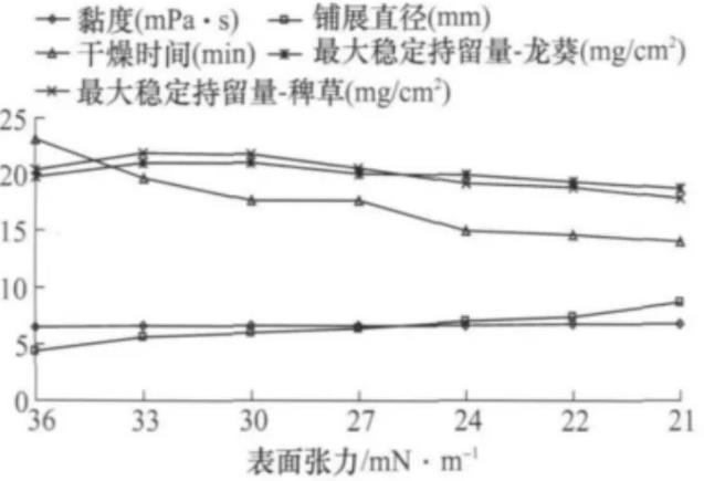 通過本研究可以說明適當?shù)亟档筒莞熟⒅苿┑谋砻鎻埩蛟黾羽ざ染商岣叱輨┑纳锘钚浴3輨┗钚阅芊癯浞职l(fā)揮往往決定于霧滴在雜草葉表面的黏著、展布、濕潤、滲透與傳導。不同雜草的葉片結構及生理機制往往對藥液理化性狀和藥液敏感性不同,本研究中液滴的鋪展直徑、干燥時間均采用石蠟模擬植物葉片蠟質(zhì)層結構,僅能體現(xiàn)藥液理化性狀的相對變化趨勢,而不同類型的雜草對藥液物理性狀和藥液敏感性需進一步研究。