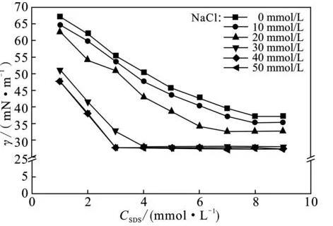 三種無機鹽的加入可以降低表面張力;當(dāng)NaCl、CuCl2,F(xiàn)e(NO3)3的濃度在40,1.25,1.25 mmol/L以下范圍內(nèi),在一定量SDS表面活性劑溶液濃度下,隨著無機鹽濃度的增加,表面張力逐漸減小;當(dāng)超過無機鹽添加濃度上限后,在一定量的SDS表面活性劑溶液濃度下,隨著無機鹽濃度的增加,表面張力將達到穩(wěn)定。同時,無機鹽濃度的增加可以降低表面張力達到最低時所對應(yīng)的SDS表面活性劑溶液濃度值(Ct),各體系下的Ct即為cmc值,當(dāng)三種無機鹽添加濃度達到上限值后,表面張力達到最小值時所對應(yīng)的SDS表面活性劑溶液濃度都是3 mmol/L,加入Fe(NO3)3、CuCl2和NaCl之后,溶液的表面張力由37.29 mN/m分別降至21.35,23.44,27.53 mN/m。