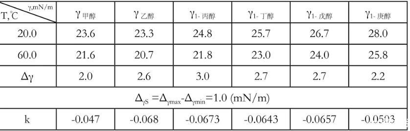 表面張力的意義,醇類在不同溫度下的表面張力測定數據