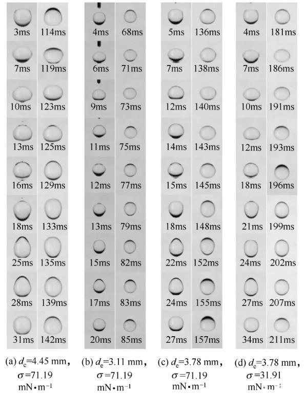 液滴運動過程中的形狀變化對液滴的蒸發、燃燒等過程有重要影響,表面張力是影響其形狀變化的因素之一。為研究表面張力對液滴形變的影響規律,采用低濃度的表面活性劑(十二烷基苯磺酸鈉SDBS)配制表面張力為30~72 mN·m?1的水溶液。利用不同外徑的針管得到3~5 mm粒徑的液滴。高速攝像機(Phantom V211,1000 pps,800×600 pixel)對這些液滴在自由落體過程中的形變規律進行了可視化實驗研究,得到了關于E?tv?s數(Eo)的半經驗關系式。實驗結果表明,液滴在自由落體過程中會形成周期性振動形變,振動周期和振幅隨表面張力增大而減小。進一步研究發現,初始時液滴形成并斷裂所引起的瞬態沖量使液滴內部動量傳遞進而表現出周期性振動形變。