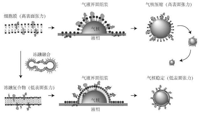 細胞膜是由蛋白質(zhì)與膽固醇等分子鑲嵌在磷脂中的典型雙分子層結構。細胞膜仿生技術已經(jīng)成功實現(xiàn)在納米顆粒以及納米液滴表面修飾組裝,并實現(xiàn)體內(nèi)的長循環(huán)以及良好生物相容性。典型的細胞膜仿生技術是將剝離后的細胞膜直接以磷脂雙分子層的形式包被于納米顆粒或液滴表面。然而由于表面張力作用,細胞膜的磷脂雙分子層無法直接包被在微米級的氣泡表面。
